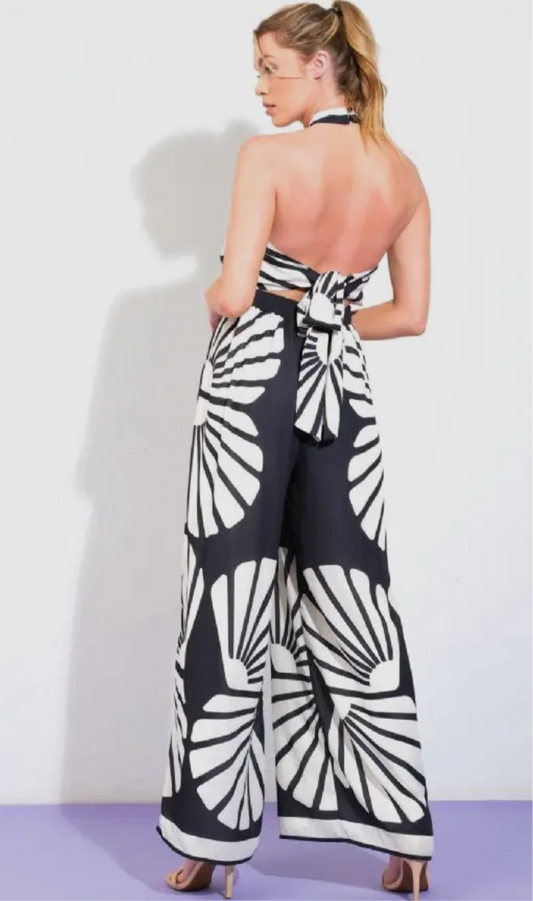 EBONY BLACK CREAM PRINT HALTER JUMPSUIT